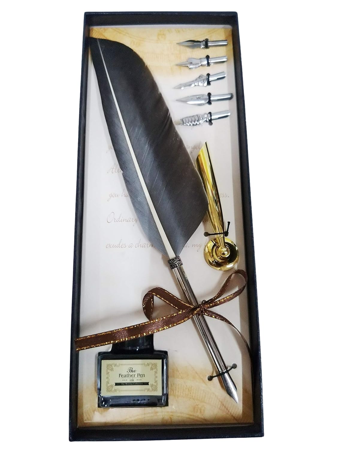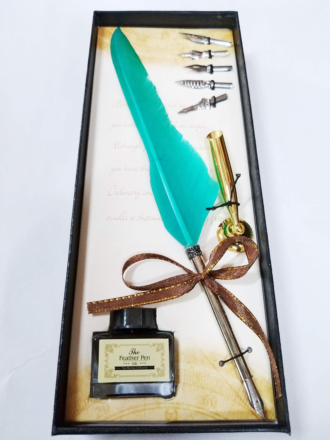 Complete Gift Set: Includes 1 feather pen with nib, 5 extra nibs, 1 ink bottle (with ink), and 1 pen nib holder – all beautifully presented in a premium gift box.